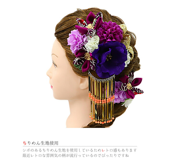 髪飾り 成人式 花 前撮り 振袖 袴 3点セット 紫 白 オフホワイト ちりめん つまみ細工 ビラ ビラ簪 キラキラ 花魁 かんざし 簪 和装 洋装 ドレス 日本製 レトロ 古典 おしゃれ 大きい 可愛い 大人 大人可愛 髪型 ヘアスタイル ヘアアレンジ